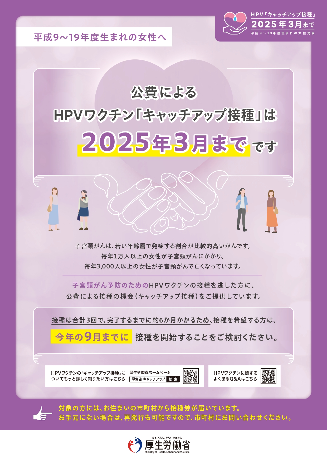 公費によるHPVワクチン「キャッチアップ接種」について 2024年08月16日 公費によるHPVワクチン「キャッチアップ接種」は2025年3月までです。接種ご希望の方は今年の9月末までに接種を開始することをご検討ください。 ご予約はこちらから↓ https://ssc6.doctorqube.com/homecare-clinic/