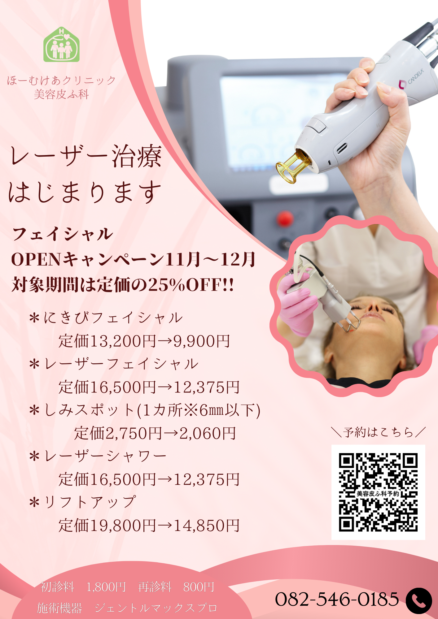 美容皮膚科にてレーザー治療を始めます! 10/15から予約開始です。(施術開始11/1~) オープンキャンペーンとして11~12月は定価の25%OFFです!
