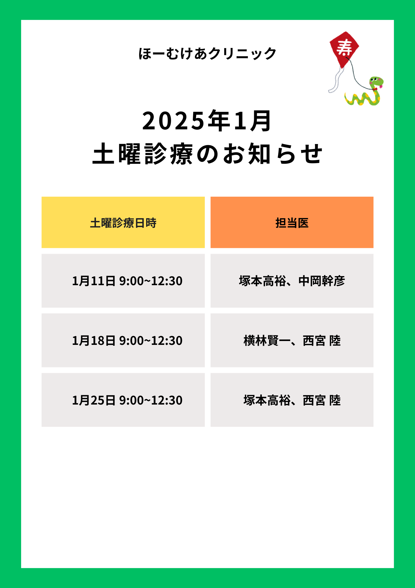 1月土曜診療のお知らせ