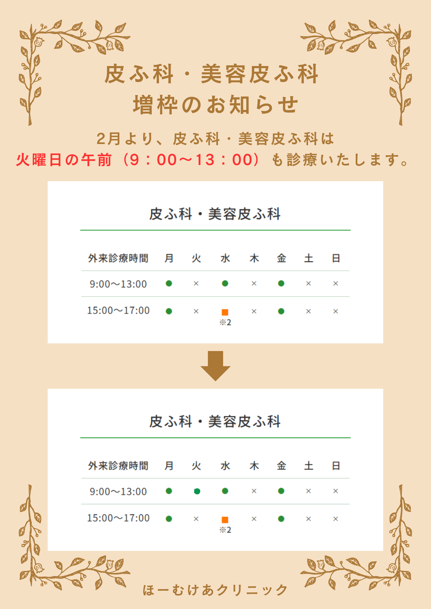 2月より、皮ふ科・美容皮ふ科は火曜日の午前(9:00~13:00)も診療いたします。