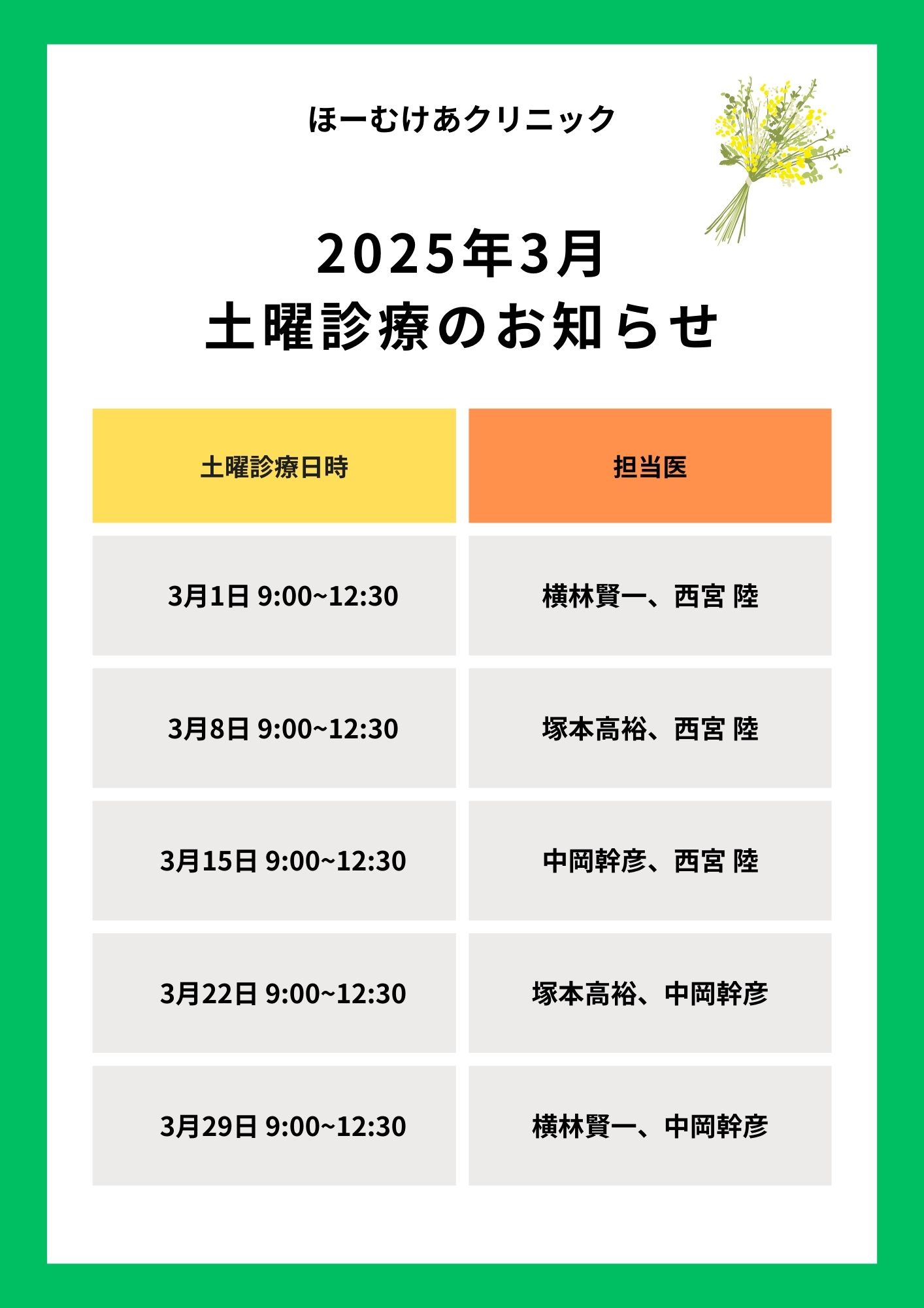 3月土曜診療のお知らせ