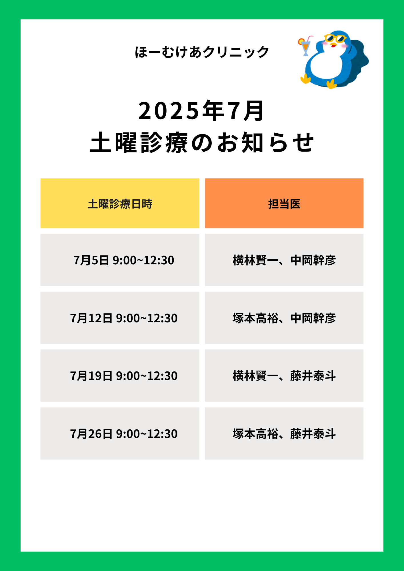 7月土曜診療のお知らせ